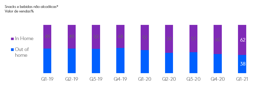 A recente alta dos preços de bens de consumo massivo (FMCG, na sigla em inglês) e a nova onda da COVID-19, contribuíram para que o consumo dentro do lar continuasse crescendo: 62% dos gastos com alimentação e bebidas não alcoólicas foram em consumo dentro do lar e apenas 38% fora do lar.