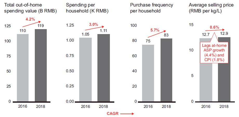 What is behind the stagnant average selling price growth for out-of-home sales? The main cause is a more competitive environment for food and beverage categories. There is now heavy competition from New Retail players, for example, and from popular online-to-offline (O2O) food delivery platforms like Meituan and Ele.me, which have heavily promoted their services by offering coupons and discounts. In addition, leading coffee and tea chains have upped their game in delivery of food and beverage products.