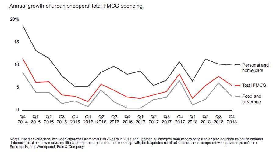 China’s market for fast-moving consumer goods (FMCG) for at-home consumption remained robust in 2018, despite general concerns about a slowdown. Total spending on FMCG rose 5.2%, a slight increase over last year’s 4.7% gain. Overall, the two-speed growth scenario we identified in 2016 has continued to evolve, with home care and personal care categories growing at a fast clip while food and beverages maintain a slower pace.Personal care categories showed the healthiest gains, growing by 10.3% compared with 10.1% in 2017. Premiumization was a big factor in that stellar performance: Average selling prices (ASP) rose by 9.8% as consumers demonstrated a willingness to trade up. Home care categories delivered strong growth of 7.2%, a rebound from their 3%–4% annual growth rate between 2014 and 2017. In home care, it was volume growth, not price increases, that led to the gains.