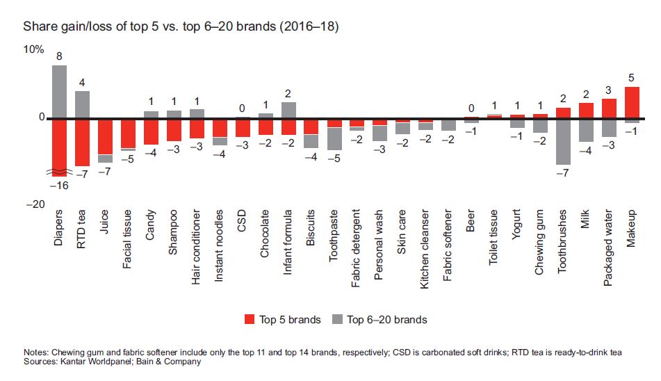 Over the last three years, those big, established brands have lost share in most categories—16% in diapers, 7% in RTD tea and 5% in juice, for example. In fact, the top five brands have managed to gain meaningful share in only four categories: toothbrushes, milk, packaged water and makeup.
