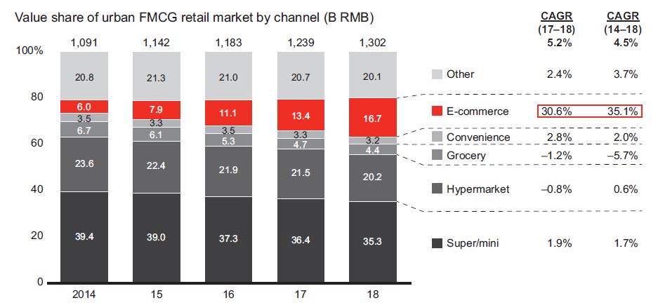 This year, Kantar Worldpanel adjusted its database to reflect the changing market reality and fast evolution of online channels. In this refreshed view, e-commerce represents an even bigger share of the urban FMCG market—16.7% in 2018 compared with 10% using the previous methodology. The data showed that e-commerce channel growth actually slowed slightly for the first time. It grew at a 35.1% annual rate from 2014 to 2018, but by 30.6% between 2017 and 2018. That’s still robust by any standard and stands in stark contrast to the 0.8% decline for hypermarkets and 1.2% drop for grocery stores in 2017–18.