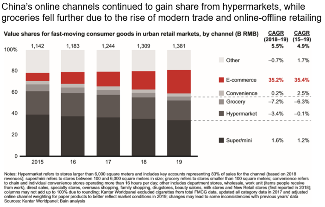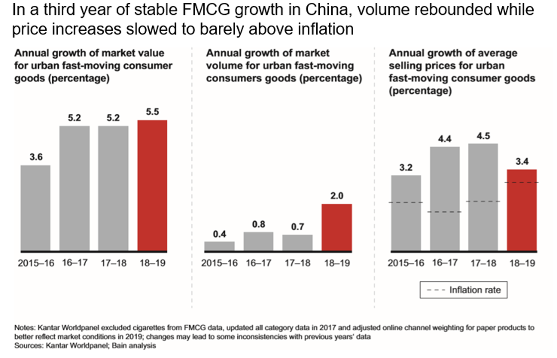 In addition to the two-speed dynamic among categories, we saw volume and prices moving in different directions. Overall FMCG volume grew 2.0%, a sizeable leap from 0.7% in 2018. However, ASP growth dropped to 3.4% from 4.5%, which is slightly higher than the inflation rate in China.