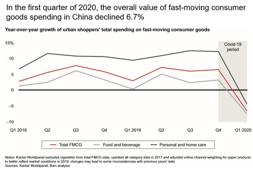 After years of supercharged value growth in China followed by two straight years of 5.2% growth, China’s overall FMCG growth of 5.5% in 2019 represented stabilization. The crisis that has dealt such a serious blow to economy has altered consumer behavior in China virtually overnight. As the nation endured lockdowns, quarantines and then a tentative recovery, consumers quickly adapted their spending patterns. Total retail sales fell by 19% the first quarter of 2020, for the biggest decline on record. Within FMCG, food and beverage spending fell 7.7%, and non-food and beverage spending fell 4.6%.