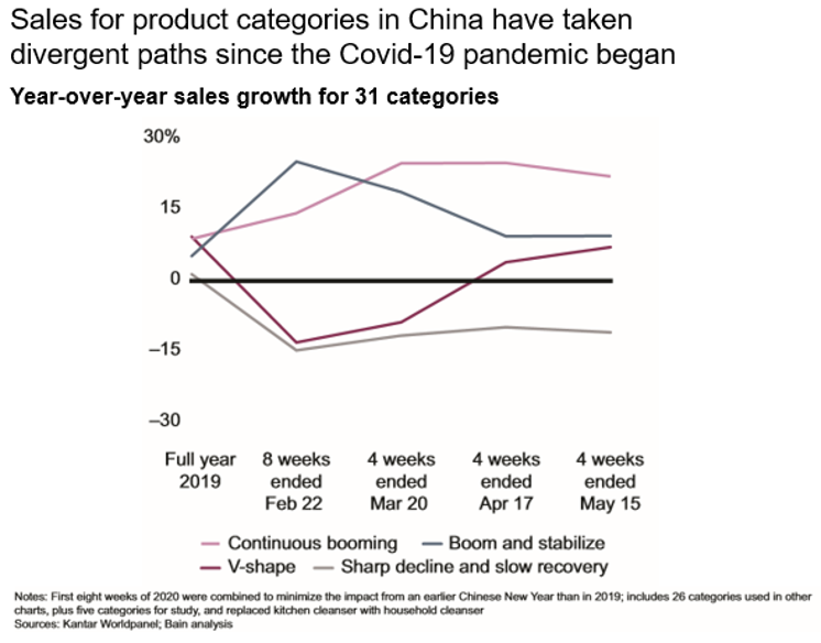 Based on the data analysis of FMCG categories by May 15 in this report, we divided the impact of Covid-19 on categories into four district ways: continuous booming, boom and stabilize, V-shape, and sharp decline and slow recovery.