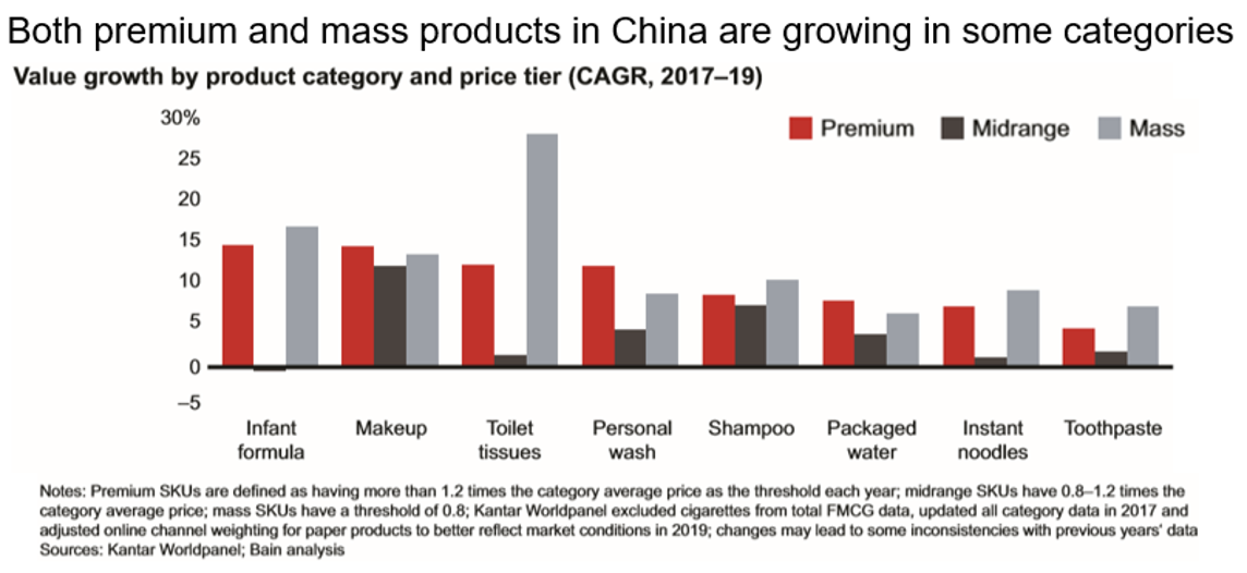 However, there is another reason that so many categories face falling ASP. Mass segments are growing as fast as premium segments, with both outpacing midrange segments. On balance, that results in slower price growth or even price declines. This polarization trend began in 2019 and, as we explain later, accelerated in the early months of the Covid-19 pandemic, when many cautious Chinese consumers shifted to value products.