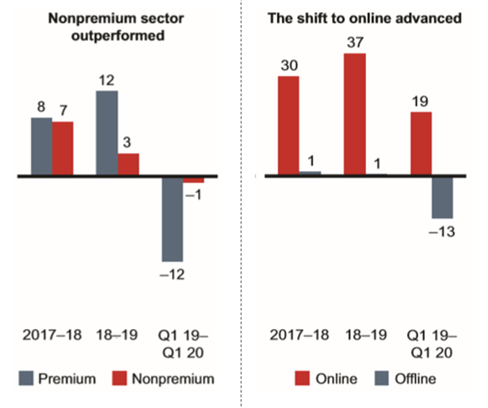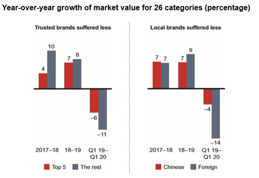 First-quarter spending in 2020 shows how consumer behavior changed. Top brands and Chinese brands suffered less as consumers showed a preference for trusted and locally relevant brands. While sales for the top 5 brands dropped 6% in the first quarter of 2020 compared with the same period in 2019, all other brands suffered much worse, with 11% losses. Similarly, local brands endured a 4% loss, compared with 14% for foreign brands, as consumers clung to the more familiar in the crisis.