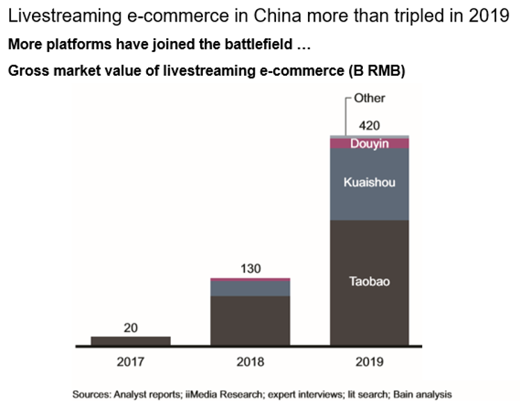 Online retailing in 2019 saw the dramatic rise of livestreaming in China. There was an explosion in the number of short, engaging personal videos that serve as a sales channel for everything from lipstick to instant noodles. Livestreaming provides immersive experiences, personalized recommendations and, as the country eventually locked down during the Covid-19 pandemic, an entertaining alternative to physical shopping trips. Virtually nonexistent three years ago, livestreaming sales on Taobao, Kuaishou, Douyin and a host of new platforms more than tripled in 2019, now accounting for 4% of total online retail sales (not only FMCG) and about 1% of total retail sales.