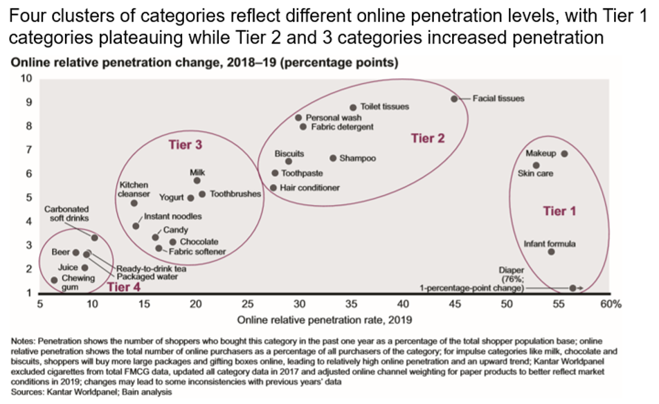 - The second and third clusters, spanning categories such as paper products, fabric detergent, chocolate and biscuits, are steadily growing their online penetration, principally through premiumization that can offset delivery costs.