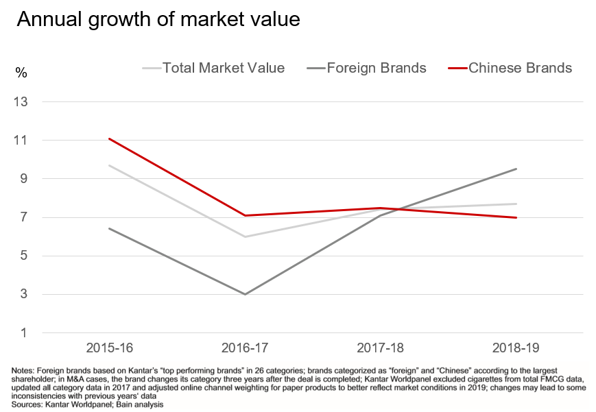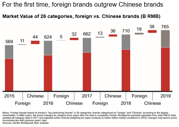For each of the past nine years, we have reported on the intense competition between foreign and domestic brands. 2019 marks a turning point. For the first time, foreign companies outpaced their domestic counterparts. Foreign FMCG companies grew 9.5% in 2019, compared with Chinese company growth of 7%. Some of the gains have been quite dramatic. L’Oreal grew sales by 35% in 2019.