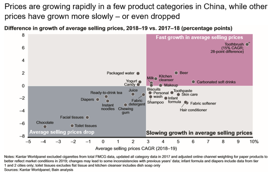 In addition to the two-speed dynamic among categories, we saw volume and prices moving in different directions. Overall FMCG volume grew 2.0%, a sizeable leap from 0.7% in 2018. However, ASP growth dropped to 3.4% from 4.5%, which is slightly higher than the inflation rate in China.