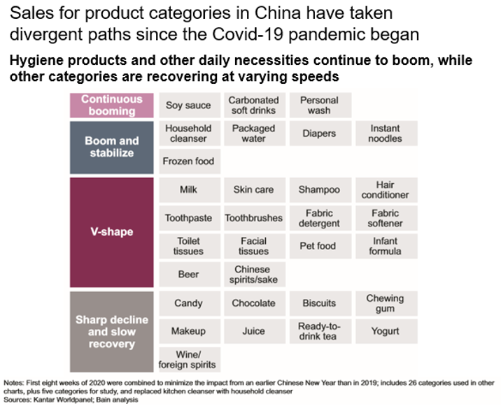 Based on the data analysis of FMCG categories by May 15 in this report, we divided the impact of Covid-19 on categories into four district ways: continuous booming, boom and stabilize, V-shape, and sharp decline and slow recovery.
