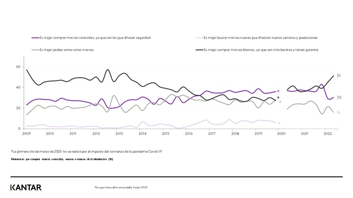 El encadenamiento lógico ante estas expectativas sobre los precios lleva a un incremento de la idea de que es mejor comprar marcas de la distribución, llegando también a niveles similares a 2012-2013. Paralelamente observamos un descenso similar de las marcas de los fabricantes en una reacción típica ante las crisis: el retorno a marcas percibidas como más baratas, que al mismo tiempo tienen la garantía de las cadenas de distribución.