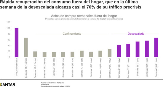 De esta forma, los actos de compra semanales fuera del hogar, que llegaron a caer hasta un 83% durante las semanas de confinamiento más estricto, han ido recuperando posiciones paulatinamente y a medida que el desconfinamiento se ha ido abriendo paso en España.