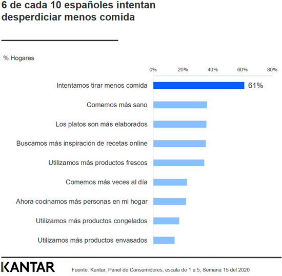 A medida que el confinamiento se alarga, aumentan las ocasiones de consumo en el hogar y las categorías de indulgencia continúan siendo las protagonistas en las cestas de la compra de los españoles, aunque durante la semana del 30 de marzo al 5 de abril se han incorporado al ranking productos como el atún fresco, la miel envasada o los aperitivos. Pero permanecer en casa también ha hecho que la población cambie su relación con la cocina, no solo se dedica más tiempo a cocinar, sino que se ha adoptado una actitud más consciente alrededor de los alimentos y la salud. Con la crisis, más de la mitad de los españoles declaran que intentan desperdiciar menos comida que antes, y una tercera parte muestra interés en comer más sano, descubrir nuevas recetas por internet y usar más productos frescos.