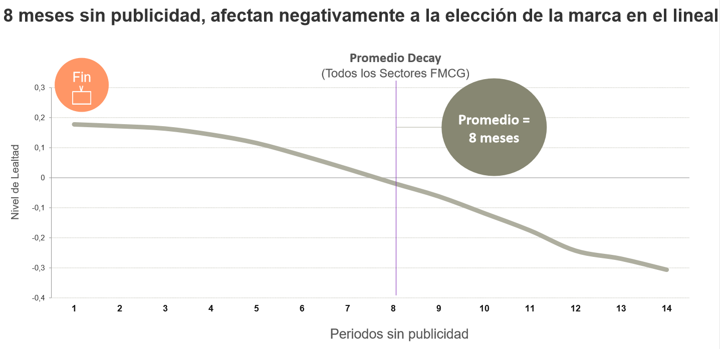 Otros aspectos de la marca que pueden salir perjudicados al dejar de hacer publicidad, son la imagen de marca o la intención de compra, algo que se traslada a los lineales y se convierte en un descenso en la elección de marcas. De hecho, gracias al Consumer Media Modelling, realizado con 200 campañas de publicidad pertenecientes al entorno de FMCG, sabemos que, si una marca pasa más de ocho meses sin anunciarse, la probabilidad de ser elegida en el lineal disminuye drásticamente. Este promedio de 8 meses varía entre 6 y 10 meses dependiendo de la categoría en la que se opere.