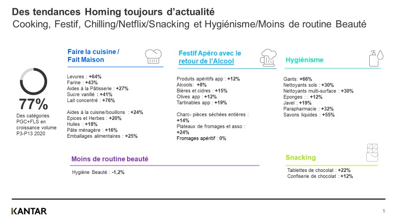 L’année 2020 a permis de voir émerger une nouvelle tendance de consommation : le homing. « C’est avant tout une philosophie de réappropriation de son intérieur. Pour nous le homing est le fait d’orienter ses achats pour se sentir bien à la maison » explique Gaëlle Le Floch. Avec le télétravail, de nouveaux rituels se sont installés. Les Français se sont adaptés et ont testé de nouvelles pratiques culinaires, grâce à de nombreuses ressources en ligne. Ils se sont également octroyé des pauses plaisirs : les ventes de chocolat (tablettes de chocolat +21%) ou de confiseries ont également connu un rebond pendant les confinements. En renouant avec les produits bruts, en faisant du bricolage ou du jardinage, ils ont aussi mesuré au passage le travail nécessaire pour produire des produits de qualité.
