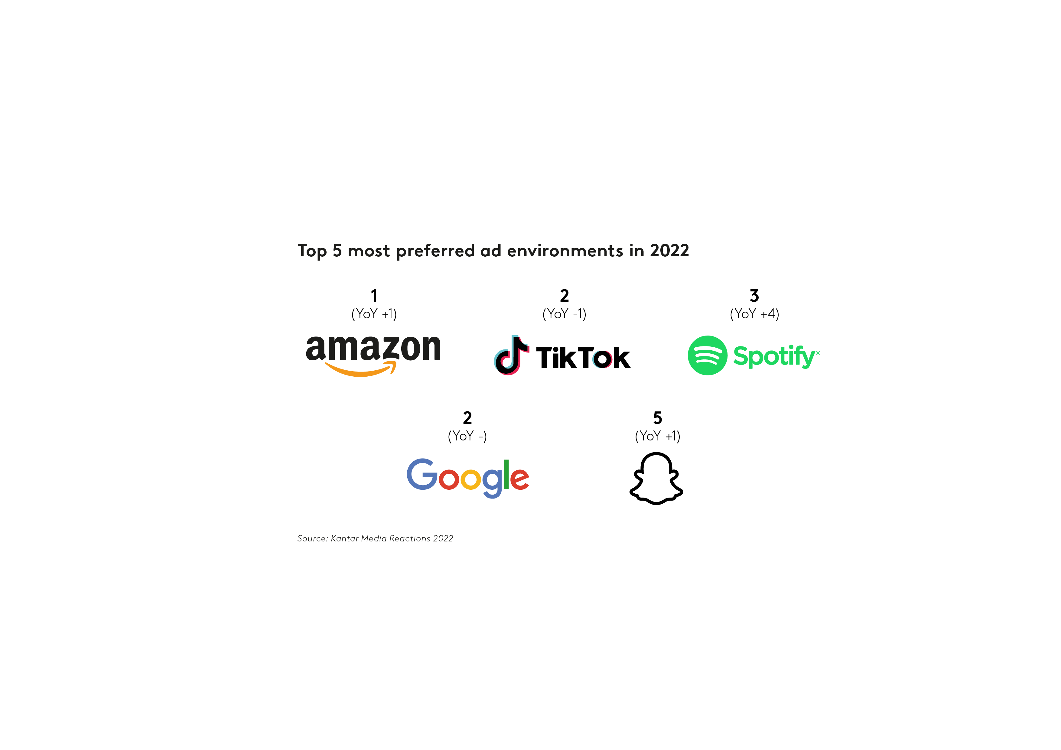 Of course, there is no one recipe for ad equity success. While the fourth-ranked player in ad equity, Google, follows a similar profile to Amazon, there are many other ways for a media brand to be a strong publisher partner for other brands. The rest of the top five prove that. TikTok was number two in ad equity in 2022 among consumers after having been the leader in the previous two years; compared to its competitors, TikTok ads are seen as the most fun and entertaining ads globally. At number five, Snapchat ads are seen as fun as well – but a further standout area for them is that they are the leader in ad equity among Gen X audiences. Third-ranked Spotify, meanwhile, is one of the least controversial brands when it comes to advertising, with very few negative perceptions.