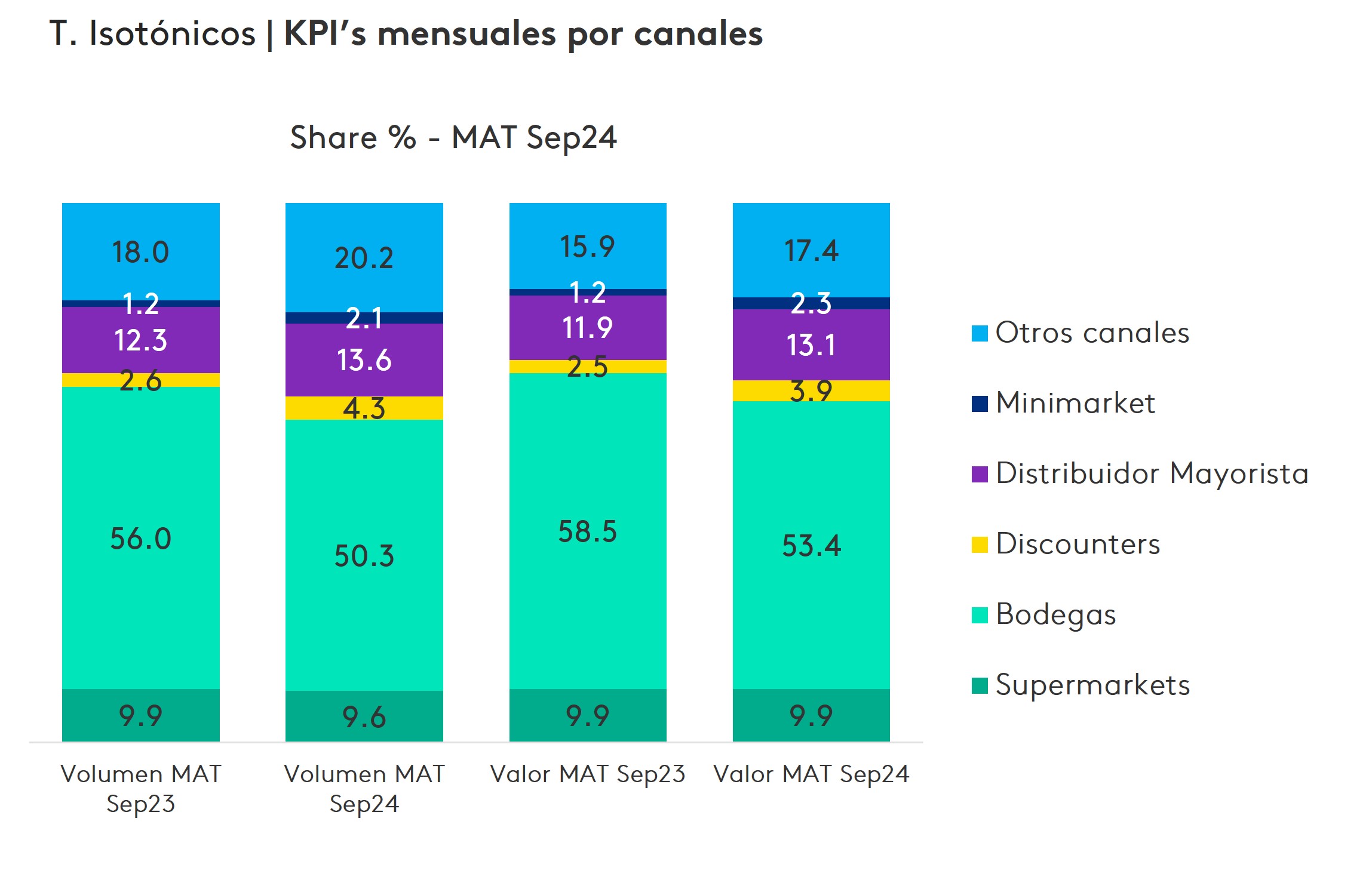 Las bodegas concentran un 53% del volumen, aunque con una caída de 5 puntos porcentuales; mientras que los distribuidores mayoristas lograron el 13% del volumen el último año. Cabe destacar que los discounters, minimarkets, y farmacias fueron los canales con mayor crecimiento.