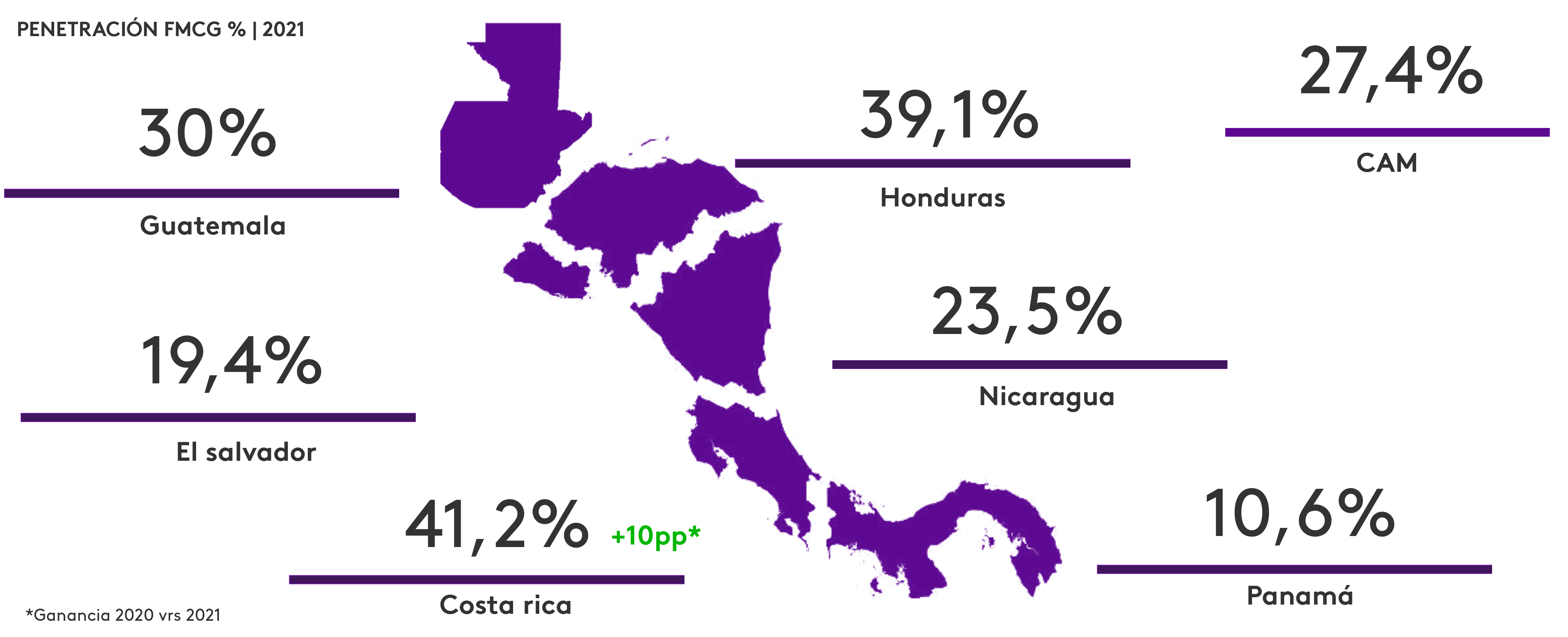 Costa Rica es el que país que alcanza la máxima penetración y donde más gana hogares en el último año, 4 de cada 10 costarricenses compran por internet productos de la canasta FMCG, donde el 44% de las compras se hacen por medio de WhatsApp y un 33% por medio de paginas web o aplicaciones de cadenas de supermercado e hipermercados.