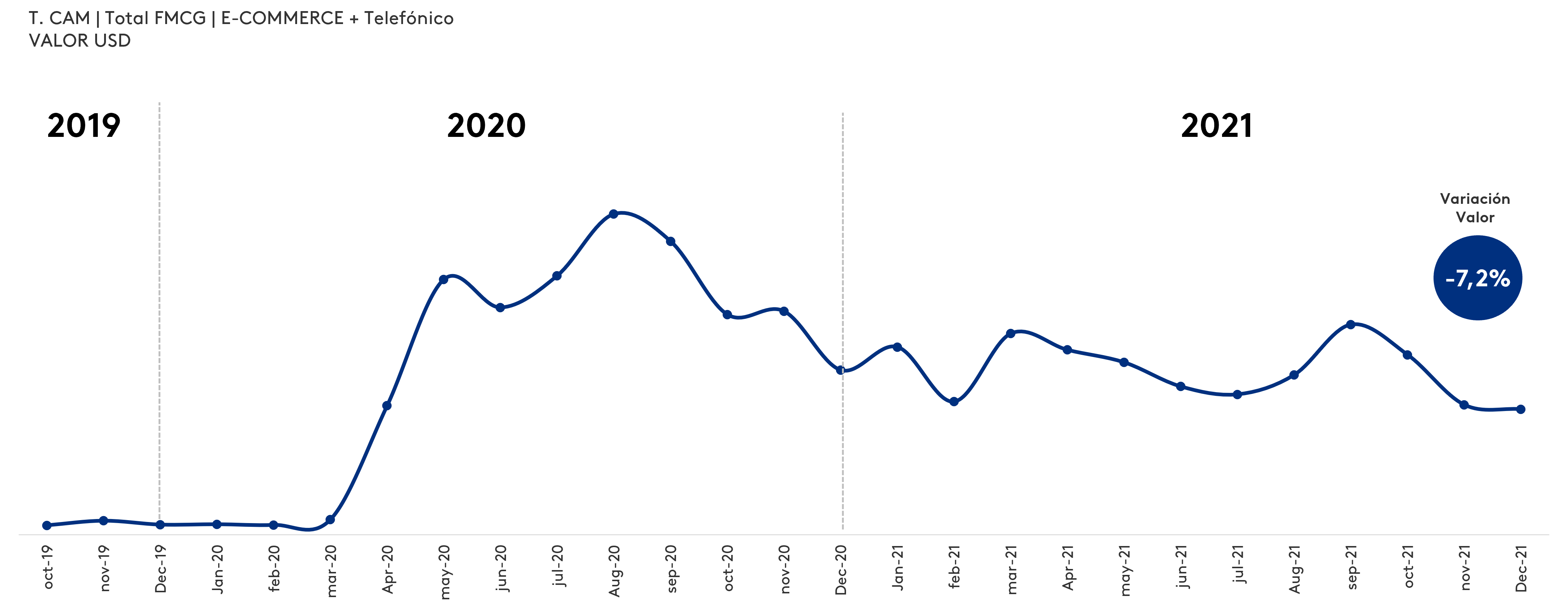 Según el estudio de Kantar llamado Ecommerce, las compras de productos de consumo masivo por medio de plataformas digitales como lo son compras por aplicaciones, WhatsApp, teléfono, páginas de internet, aunque desaceleran su crecimiento un -7,2%, para 2021 continúan ganando hogares compradores, llegando a 2 216 000 compradores, lo que representa un crecimiento del 19% versus 2020, siendo un negocio de 85 millones de dólares.