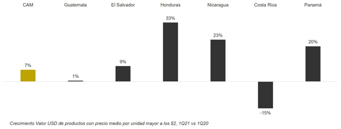 Este mayor desembolso está relacionado con que los hogares están gastando más en productos de mayor precio, por ejemplo, en el primer trimestre del año el 64% del crecimiento de la canasta de consumo masivo es aportada por los productos que tienen un precio medio por unidad mayor a los $2 dólares, esto va influenciado por varios factores, ya que vienen en crecimiento las marcas premium, 4% a total Centroamérica, impulsado por compras de tamaños grandes y de packs.