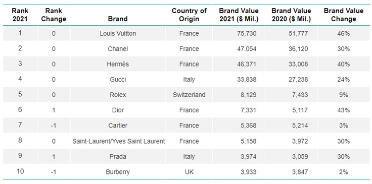 Las marcas europeas siguen dominando la clasificación de las marcas de lujo y las 10 marcas más valiosas de este sector obtuvieron buenos resultados el año pasado gracias a su importante exposición mundial. A pesar de un año en el que se redujeron los viajes (de los que dependen muchas marcas de lujo europeas), Louis Vuitton y Dior registraron un crecimiento superior al promedio, sustentado por un posicionamiento diferenciado. En conjunto, la categoría de marcas de lujo registró un aumento del 34% en valor.
