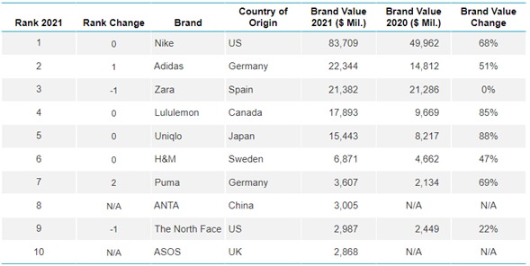 + La marca británica ASOS y la marca deportiva china ANTA entraron por primera vez en la clasificación de la categoría gracias al éxito interno en sus mercados de origen. El crecimiento de ASOS se debe a su fuerte oferta digital y a su diferenciación, ya que se considera que tiene una personalidad heroica y rebelde que la distingue de sus competidores. En cambio, ANTA aprovechó las tendencias de salud y bienestar de los últimos años,