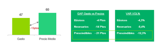 Esta diferencia entre los precios y el gasto de los hogares se traduce en una pérdida del volumen de compra (-7% FMCG a Q2-19), siendo las categorías prescindibles las que presentaron el mayor gap presupuestario e impacto en volumen.