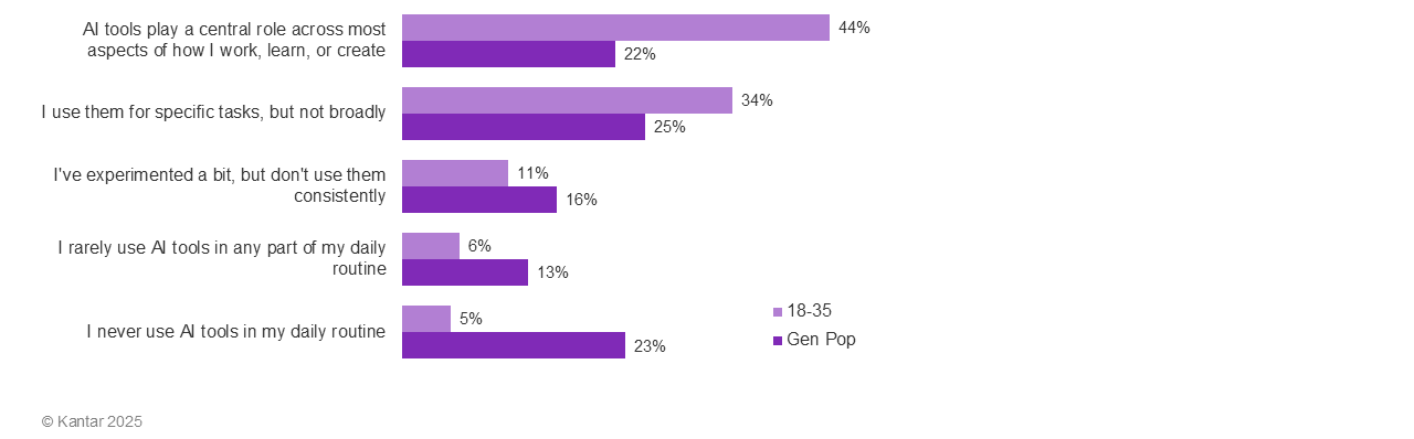 First, we must dispel any notion that consumer use of AI is a future behavior we can address later. Hype has turned into quotidian reality. Our study found that more than half of consumers aged 18 to 70 use AI at least a few times a week – and nearly a quarter use it every day.