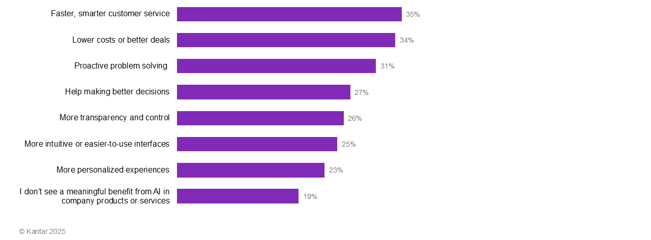 Overwhelmingly, people expect companies to use AI to improve what they offer. Four in five (81%) see at least some meaningful benefits from AI in company products and services, rising to 95% among younger consumers. And people think companies should use AI for faster and smarter customer service, lower costs or better deals, proactive problem solving, and help making better decisions.