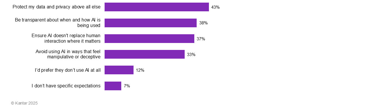 However, consumers think that the ends of AI innovation, such as lower costs and smarter services, cannot be separated from the means companies pursue to achieve them. While the appetite for AI-powered benefits is strong, it is matched by an equally strong insistence on ethical guardrails. People want companies to respect their data and privacy, to be transparent about where and how AI is being used, to ensure AI doesn’t replace human interaction where it matters, and to avoid using AI in ways that feel manipulative or deceptive.