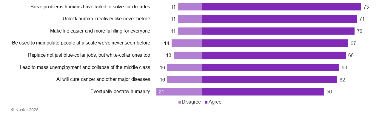 In fact, when we asked about potential extreme future scenarios, younger people’s optimism at first seemed unbounded. Three quarters (73%) said AI could solve problems humans have failed to solve; similar numbers think it might unlock human creativity like never before (71%) and make life easier and more fulfilling for everyone (70%).