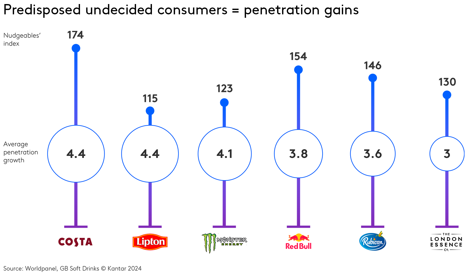 Our study proves that there is a strong correlation between penetration growth and % of Nudgeables for a brand. A recent case study from the UK reveals that 77% of growing soft drink brands are over-represented by these brand-switchers. To illustrate, we picked the top six medium sized brands in terms of five-year average penetration growth – Costa, Monster, Red Bull, London Essence Co., Lipton Ice, and Rubicon; all these brands reported significant over-representation of Nudgeables vs. their category.