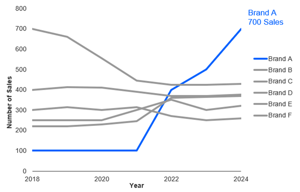 In the second chart, you can see that brand A has seen an increase in the number of sales since 2021 and is now at 700.