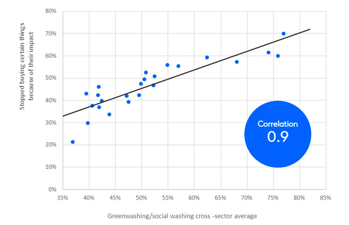 Kantar’s Sustainability Sector Index data suggests 52% of consumers believe companies distribute misleading or false information about their sustainability efforts. The commercial consequence is clear. Kantar's data shows a 0.9 point correlation between perceived greenwashing and rejection of a given brand, product, service.