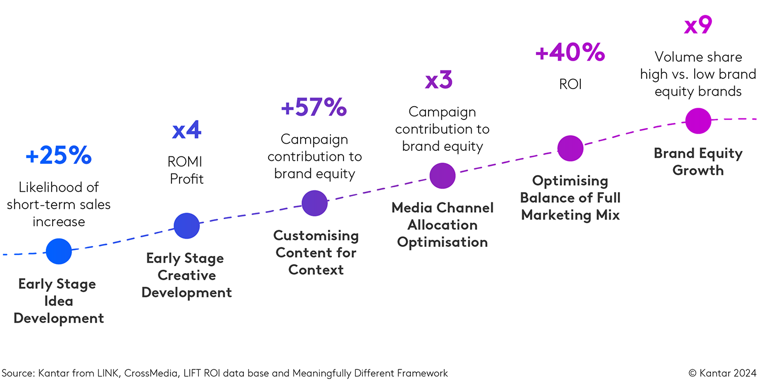 Creative quality is a key ingredient of a successful campaign. In fact, it is the second most important element in advertising profitability behind brand size. And it’s the top element within the marketer’s control. Various media elements support creative quality, including multimedia campaigns, phasing and targeting, all adding up to a big part of profitable advertising. This means that high quality ads can make or break a campaign, especially when media budget is low. Likewise, brand health is directly influenced by where advertising is placed. Kantar Context Lab data shows us that ads placed in environments where consumers are receptive to seeing advertising have seven times the impact on their brand, compared to environments where ad receptivity is low. All in all, the multiplier effects from an integrated end-to-end effectiveness program that considers both creative and media are huge.