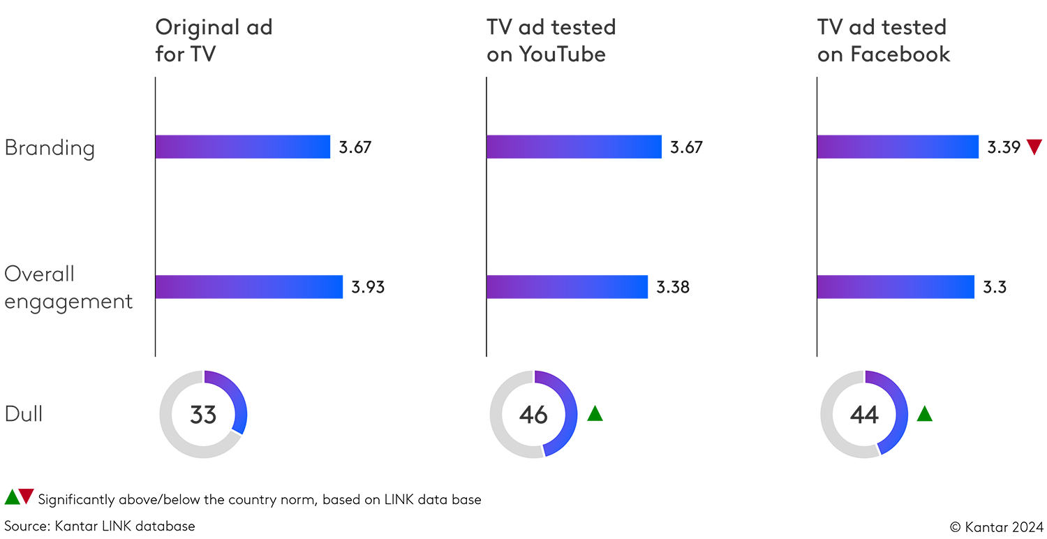 A LINK case study for a brand launch in Europe showcases the complications of placing an ad in multiple platforms unfit for purpose. The same video ad was tested across TV, Facebook and YouTube contexts, where engagement across the digital platforms was less positive than for the TV copy, with many viewers finding the ad dull. In the same campaign, branding was poor in the Facebook context where skipping is most prevalent and average skip time comes before the brand was introduced. So this ad that was built for TV worked the best on TV, and was especially unfit to be a skippable ad. The Facebook execution needed a strong hook to keep viewers watching and very early visual branding to ensure those who skip quickly still get exposed to the brand to create awareness. On the other hand, the YouTube execution needed to be entertaining enough to not put off viewers whose experience is interrupted. Overall, we know from our LINK database that 1 in 3 TV ads don’t perform well when placed in a digital context.