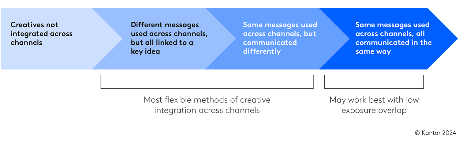 The ads on each platform need to be made or edited to consider what that platform’s nature is, feeling authentic and belonging there, while still standing out from the clutter of ads online. But it is not only customization that matters. A creative’s nature also needs to be considered down to the phasing and laydown of a campaign. For example, the messaging of a campaign and whether these differ from ad to ad needs to be decided depending on the laydown, and vice versa. Different channels may communicate different ideas as long as messages tie to the same campaign idea and carry the same distinctive assets. This is the most flexible method of creative integration across channels and can work with different levels of exposure overlap between channels. When the activity is planned to have low levels of exposure overlap, it might be acceptable to use the same message communicated in the same way across channels.
