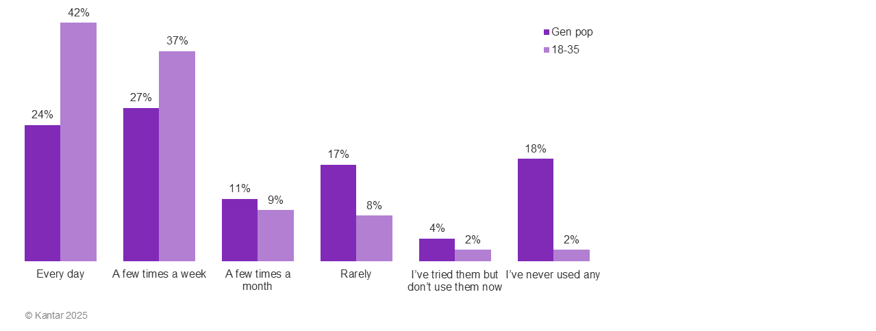 First, we must dispel any notion that consumer use of AI is a future behavior we can address later. Hype has turned into quotidian reality. Our study found that more than half of consumers aged 18 to 70 use AI at least a few times a week – and nearly a quarter use it every day.