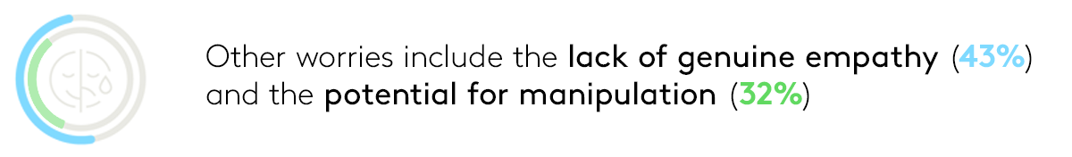 When asked about their concerns with AI emotional support tools, privacy and data security (50%) top the list among global consumers. Other key concerns include AI’s lack of genuine empathy (43%) and the potential for emotional manipulation (32%).