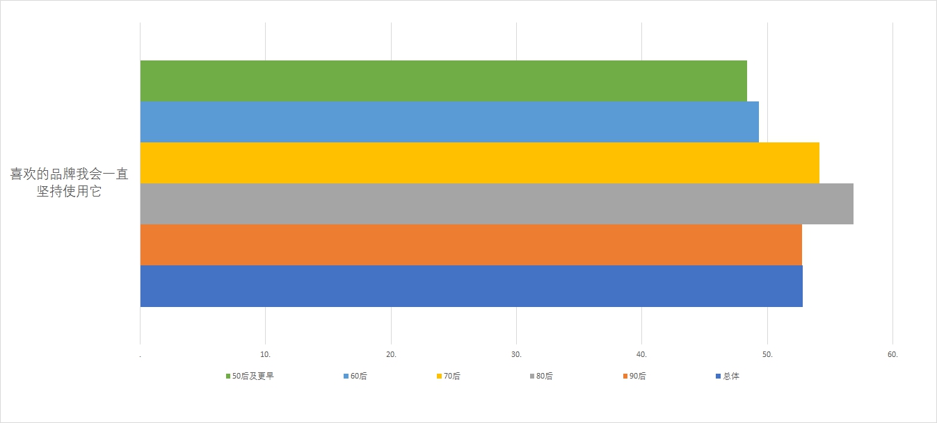 比如品牌忠诚度80后明显高出,90后甚至低于70后,仅与全国平均数持平:
