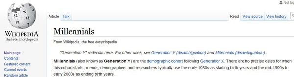 维基百科:“千禧一代”(也被称作“Y世代”),是继X世代之后的一代人。没有明确的定义指明他们从哪一年开始的,但一般人口统计学家和研究人员会将这代人的最早出生年份定义为1980年代初,最后出生年份定义为1990年代中至21世纪最初。它们被称为“千禧一代”是因为他们中最早的一代将在2000年高中毕业,进入主力消费人群。