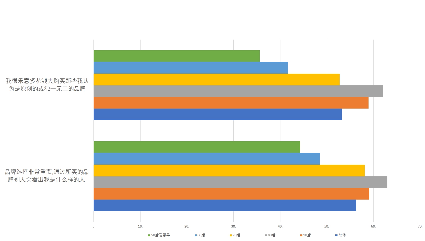 80后对于原创品牌和独一无二品牌更愿意用钱包支持,因为品牌可以让人看出自己是什么样的人。90后在这两方面的认同度都不如80后。