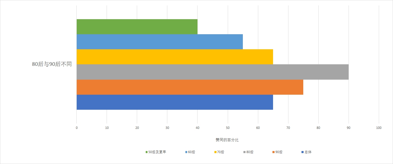 从CNRS-TGI数据来看,80后和90后的确在不少问题上的态度一致,而且与其它年龄的人群显著不同。