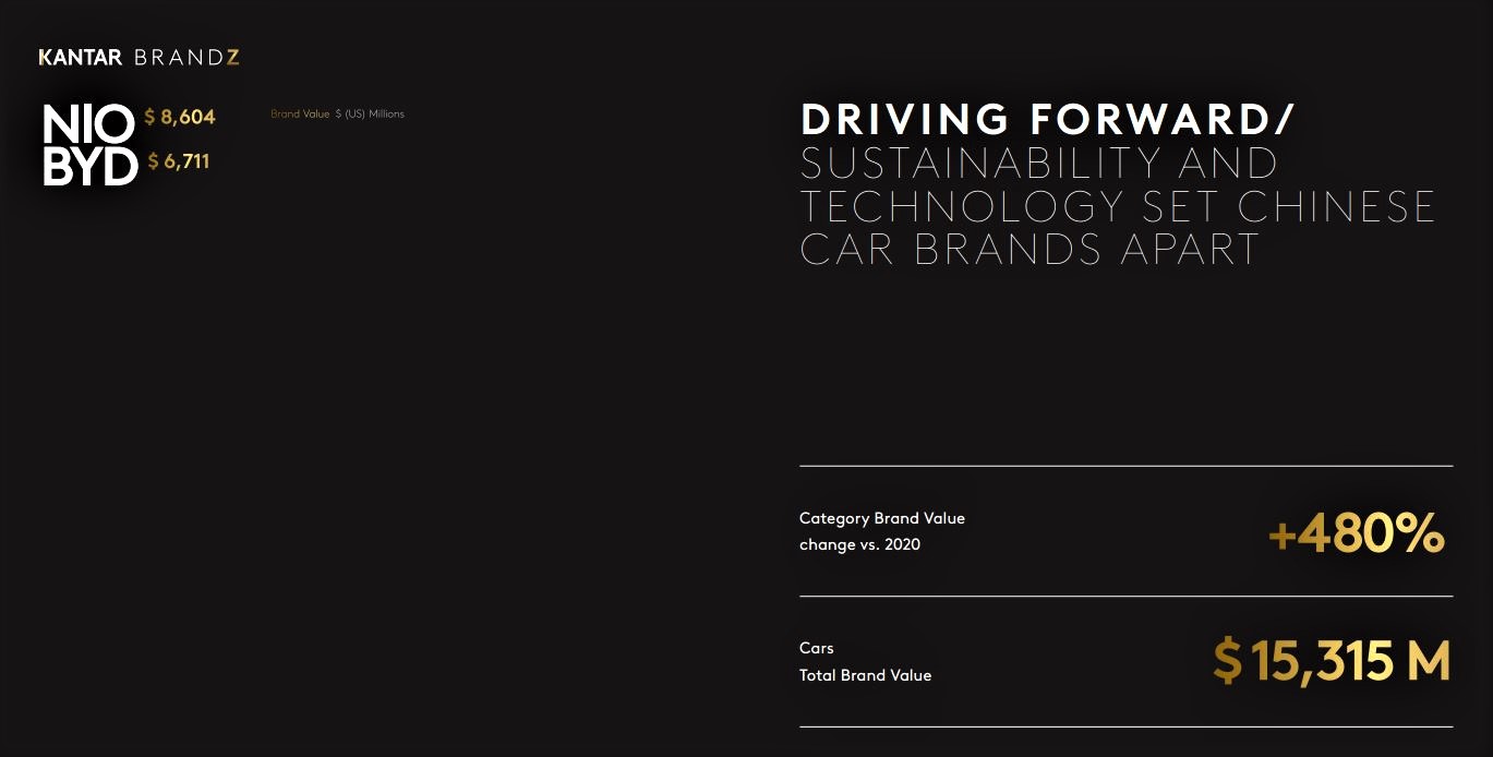 2021 Kantar BrandZ™Top 100 Most Valuable Chinese Brands report showed that the Cars category grewa mammoth 480% year on year, as returning brand BYD grew by 154% and New Energy Vehicle (NEV) brand NIO joined the China Top 100 for the first time. Looking forwards, it may not be long before a Chinese New Energy Vehicles (NEV) start-up joins the ranks of the world’s valuable and fastest-growing brands. This year, around 10% of new car sales in China are expected to be NEVs, and the market is likely to grow at 40% per annum for the next few years.
