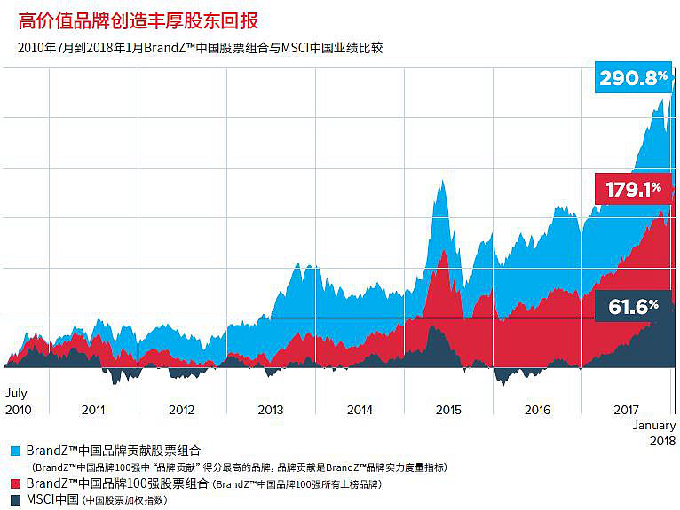 与此同时,包含各年上榜品牌的BrandZ™中国品牌股票组合自2010年7月以来上涨了179.1%,几乎是MSCI中国指数的3倍,后者同期仅增长61.6%。