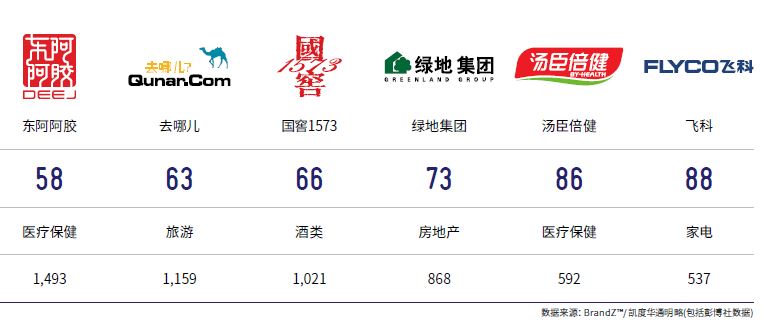 * 2018年新进榜单的品牌有:物流公司顺丰速运(排名第11),圆通速递(排名第36),韵达快递(排名第37),中通快递(排名第38)和申通快递(排名第55);;旅行社去哪儿(排名第63);酒品牌国窖1573(排名第66);房地产公司绿地集团(排名第73);保健品牌东阿阿胶(排名第58名)、汤臣倍健(排名第86)和家电品牌飞科(排名第88)。